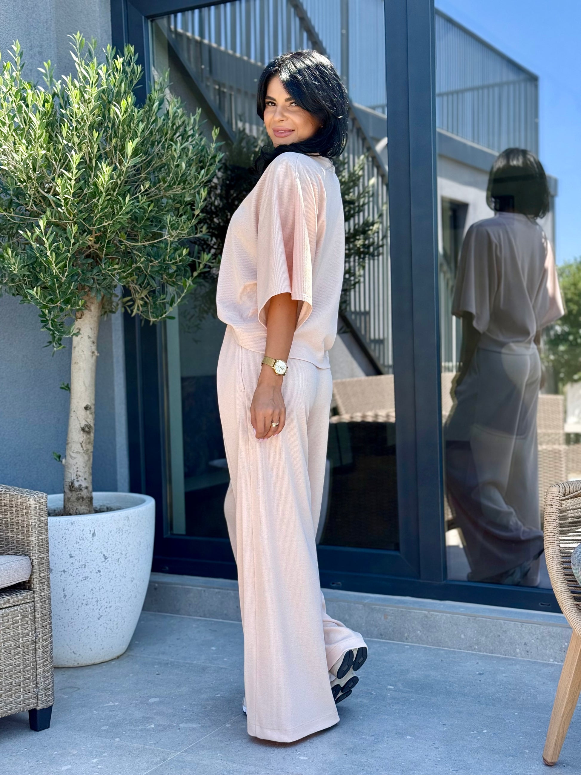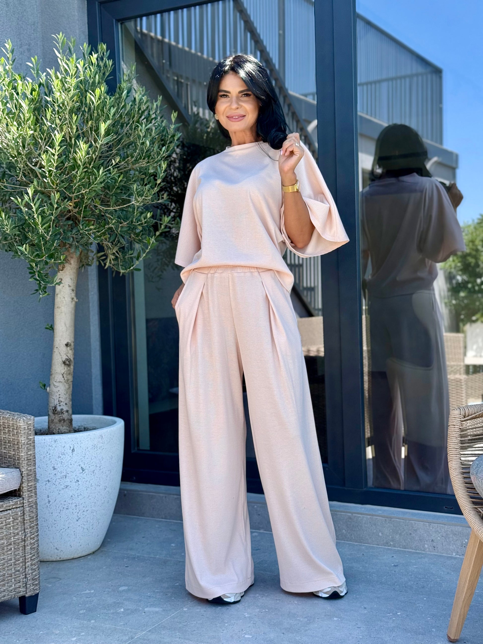 Costumul este compus din bluza cu croi drept, usor oversized, maneci largi trei sferturi si un decolteu rotund elegant. Pantalonii sunt lungi, evazati, cu talie elastica, oferind libertate de miscare si confort maxim. Tesatura are o textura usor fluida, perfecta pentru zilele active in care vrei sa te simti bine, dar si sa arati impecabil.