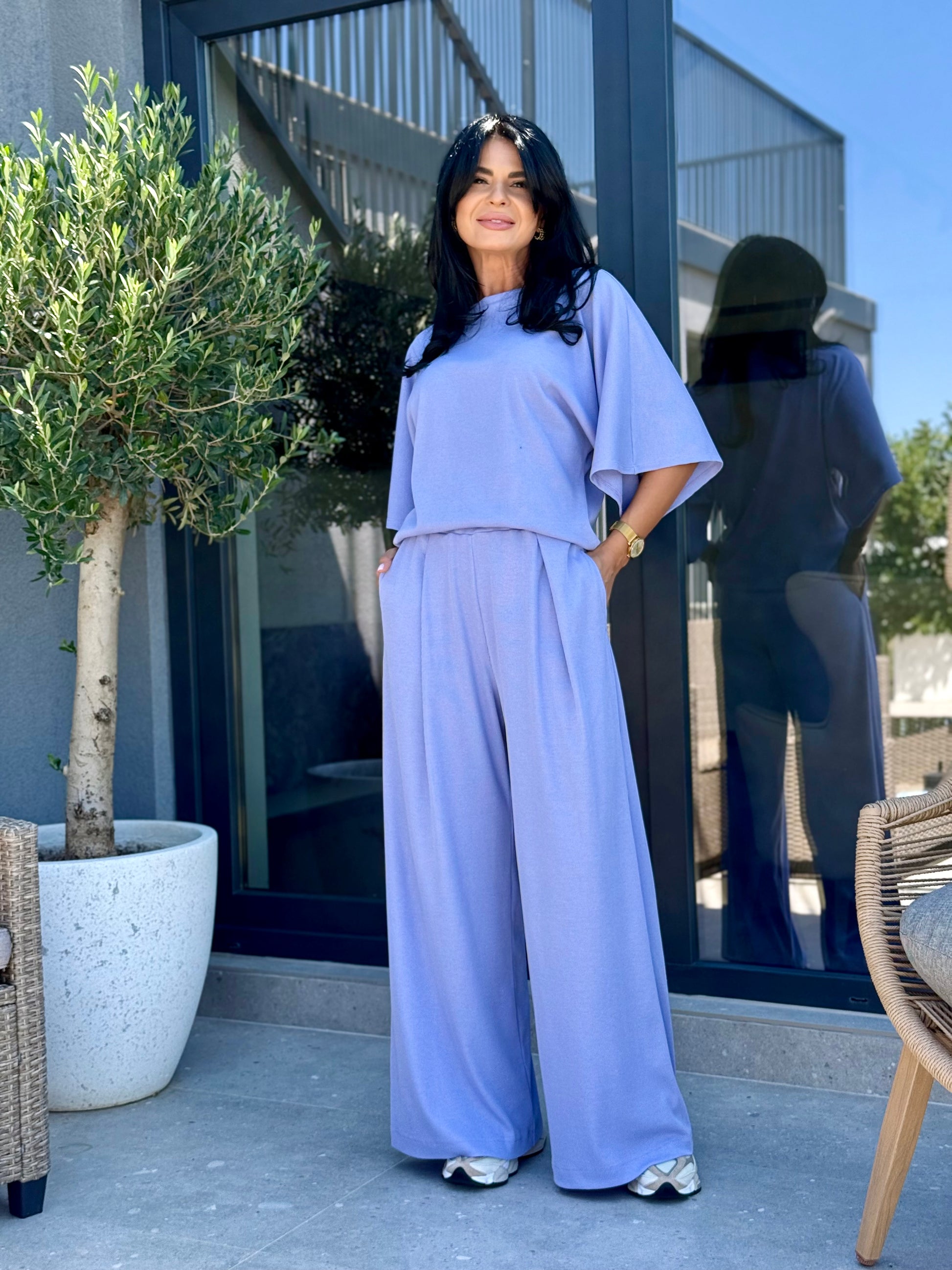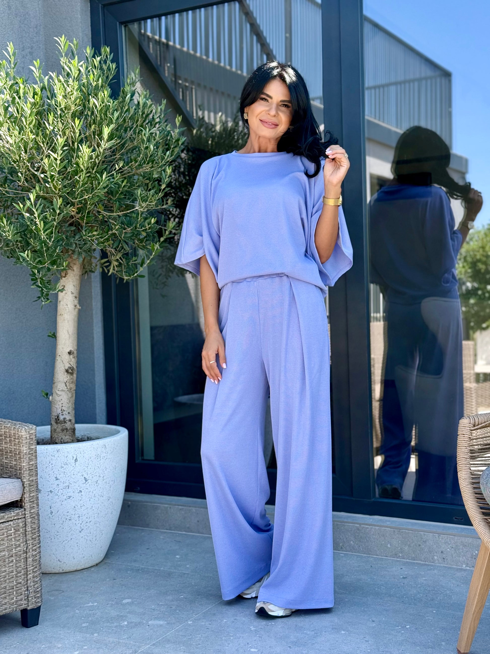 Costumul este compus din bluza cu croi drept, usor oversized, maneci largi trei sferturi si un decolteu rotund elegant. Pantalonii sunt lungi, evazati, cu talie elastica, oferind libertate de miscare si confort maxim. Tesatura are o textura usor fluida, perfecta pentru zilele active in care vrei sa te simti bine, dar si sa arati impecabil.