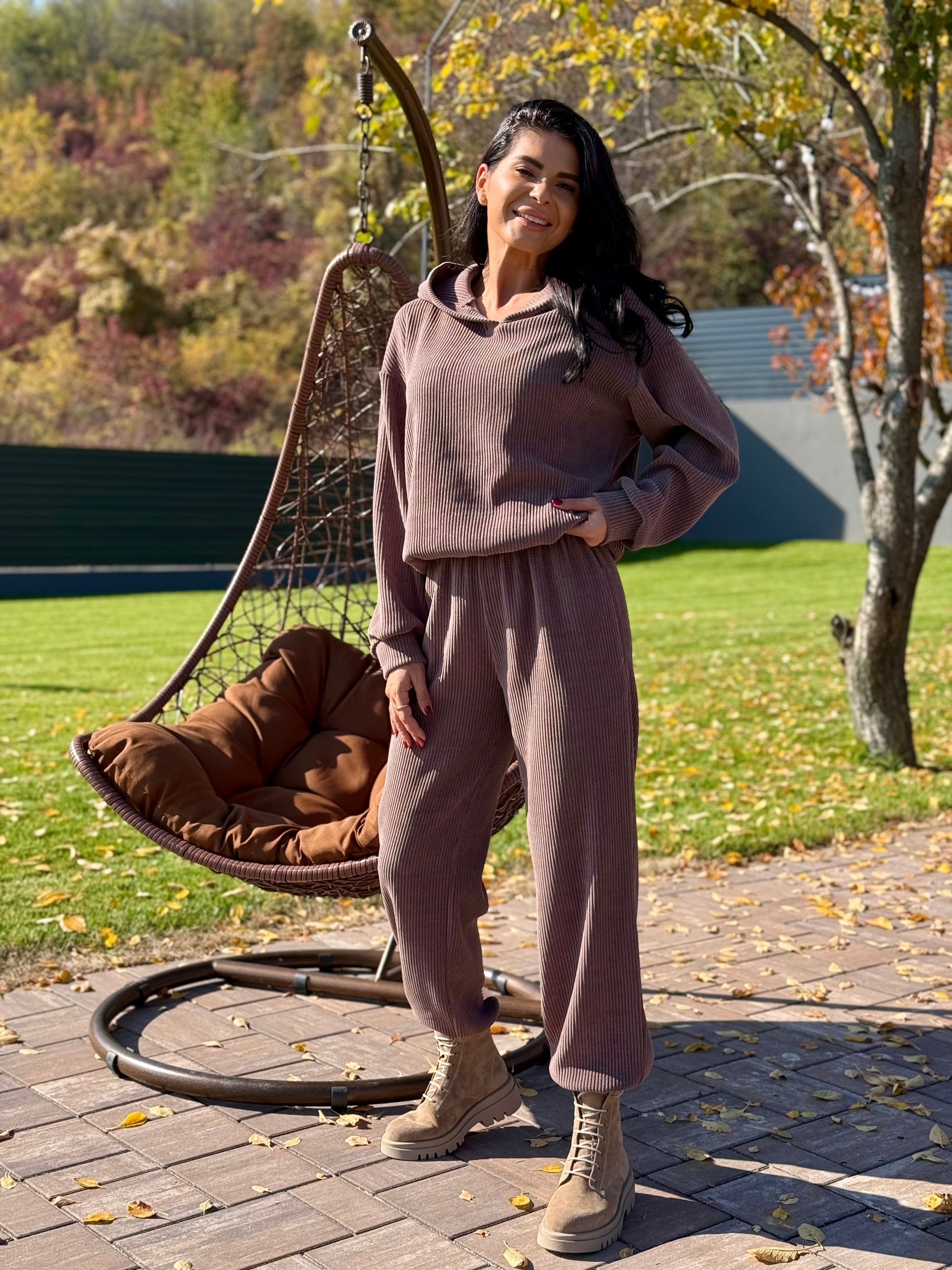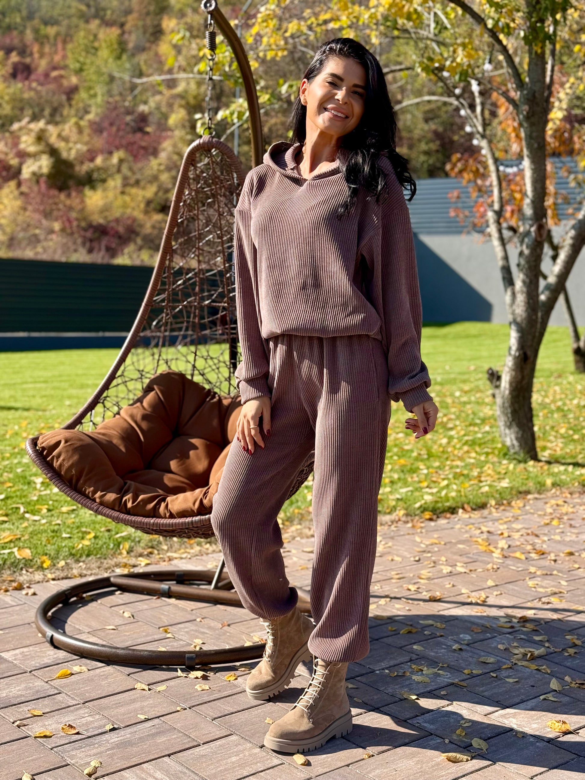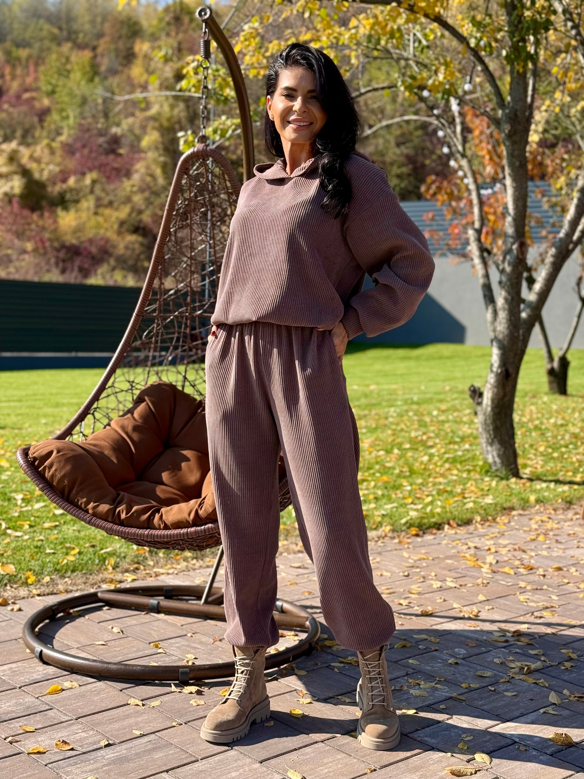 Set din catifea reiata moale, placuta la atingere, ideal pentru zilele racoroase. Bluza are croiala lejera, gluga practica si banda elastica in talie, care ofera confort si libertate de miscare. Manecile pot fi purtate lejer sau usor ridicate, datorita mansetelor elastice. Pantalonii au talie si mansete elastice, buzunare fata si buzunar aplicat pe spate.