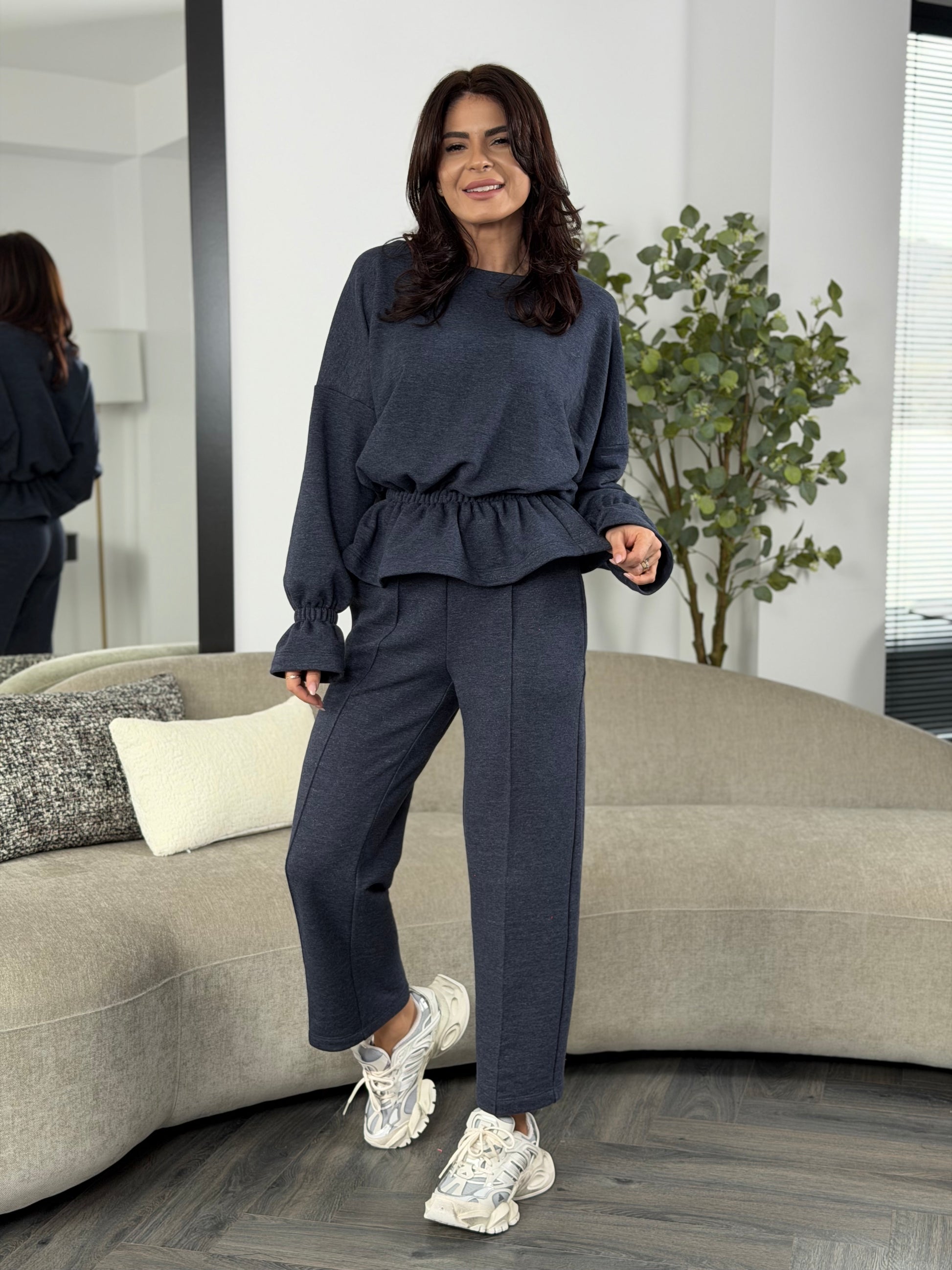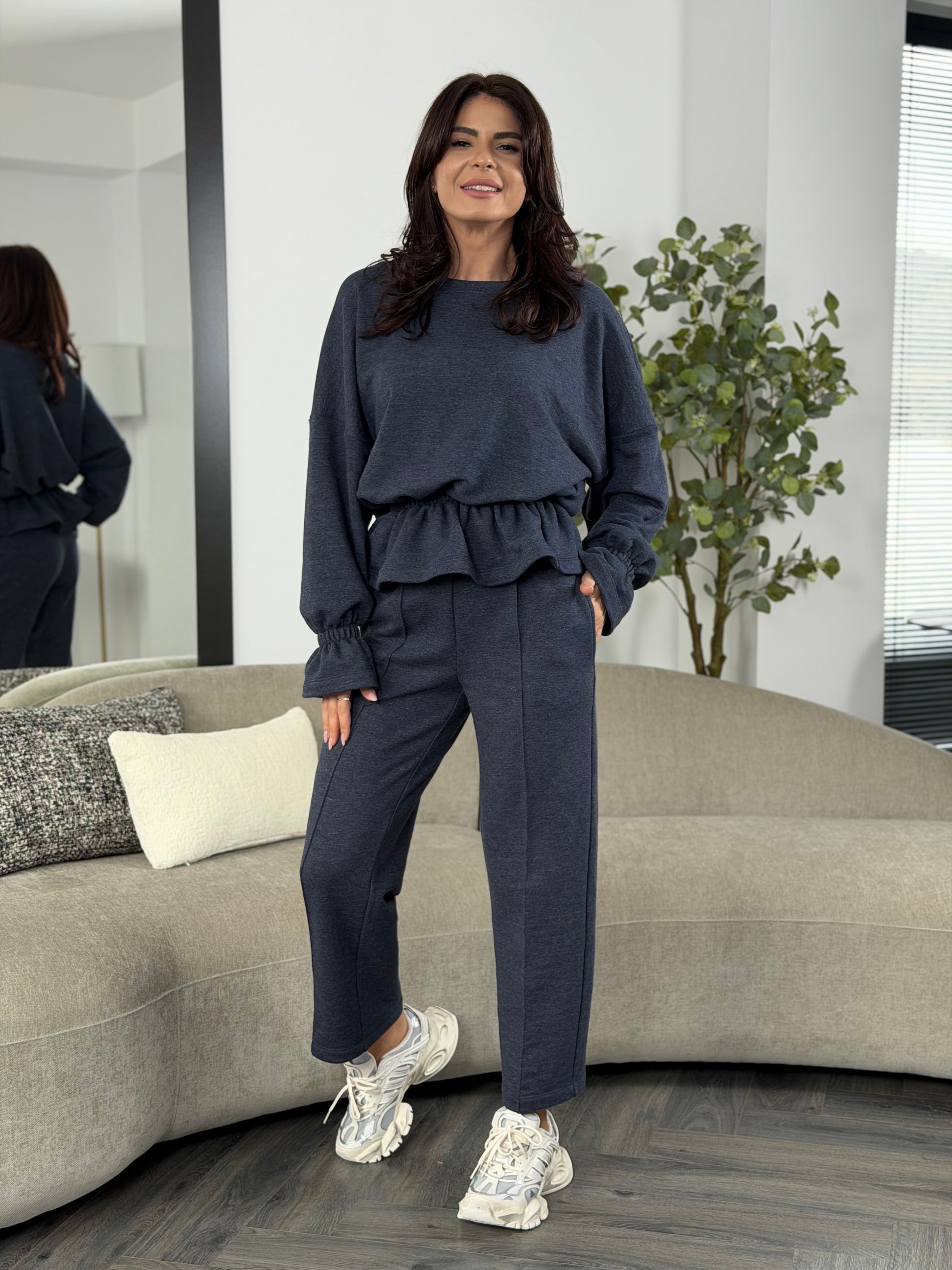 Set din bumbac cu textură moale și plăcută, creat pentru confortul de zi cu zi. Bluza are croială relaxată, cu elastic în talie ce oferă o așezare frumoasă și echilibrată, iar pantalonii au note drepte, ușor conice, care alungesc vizual silueta.