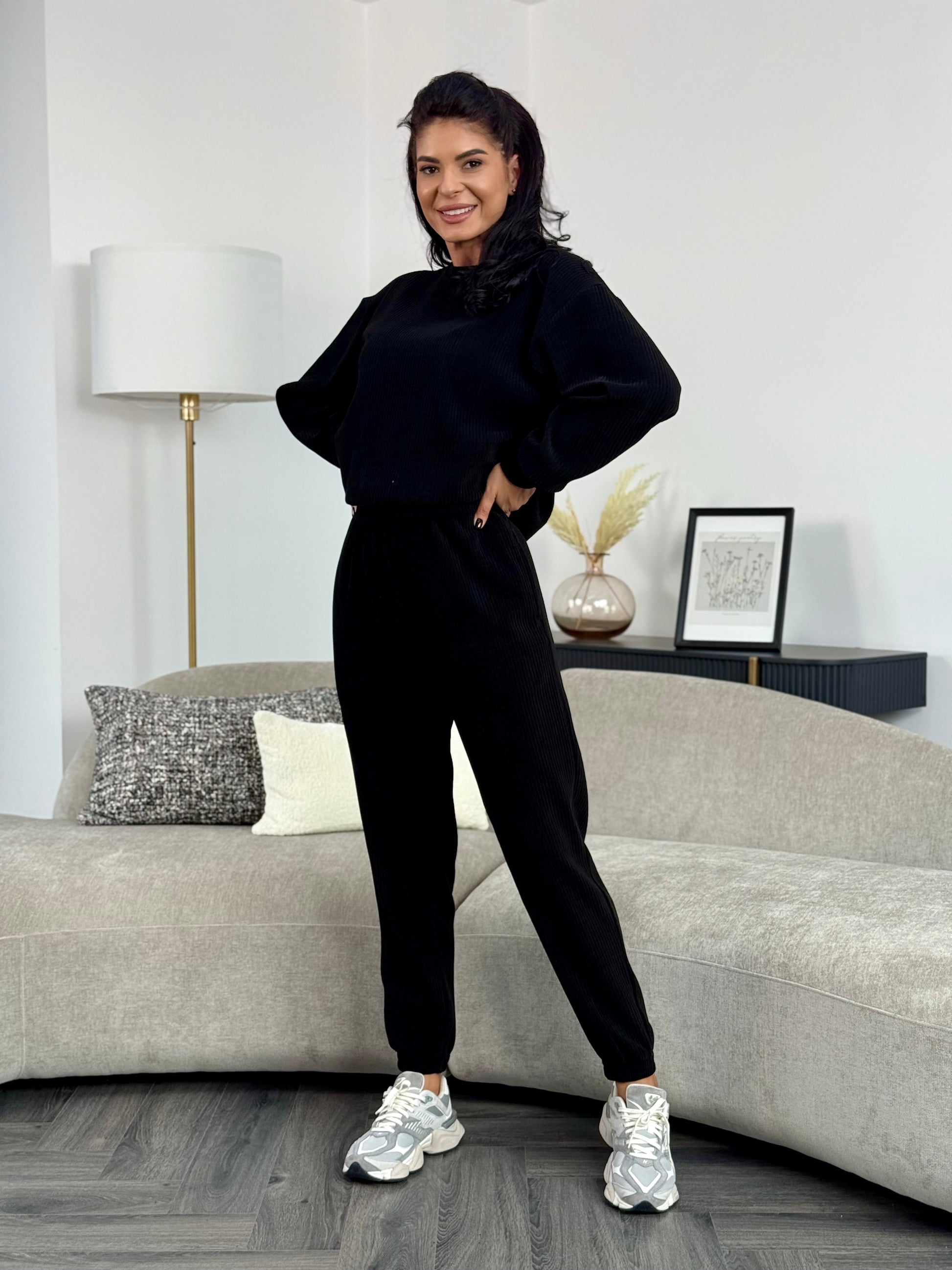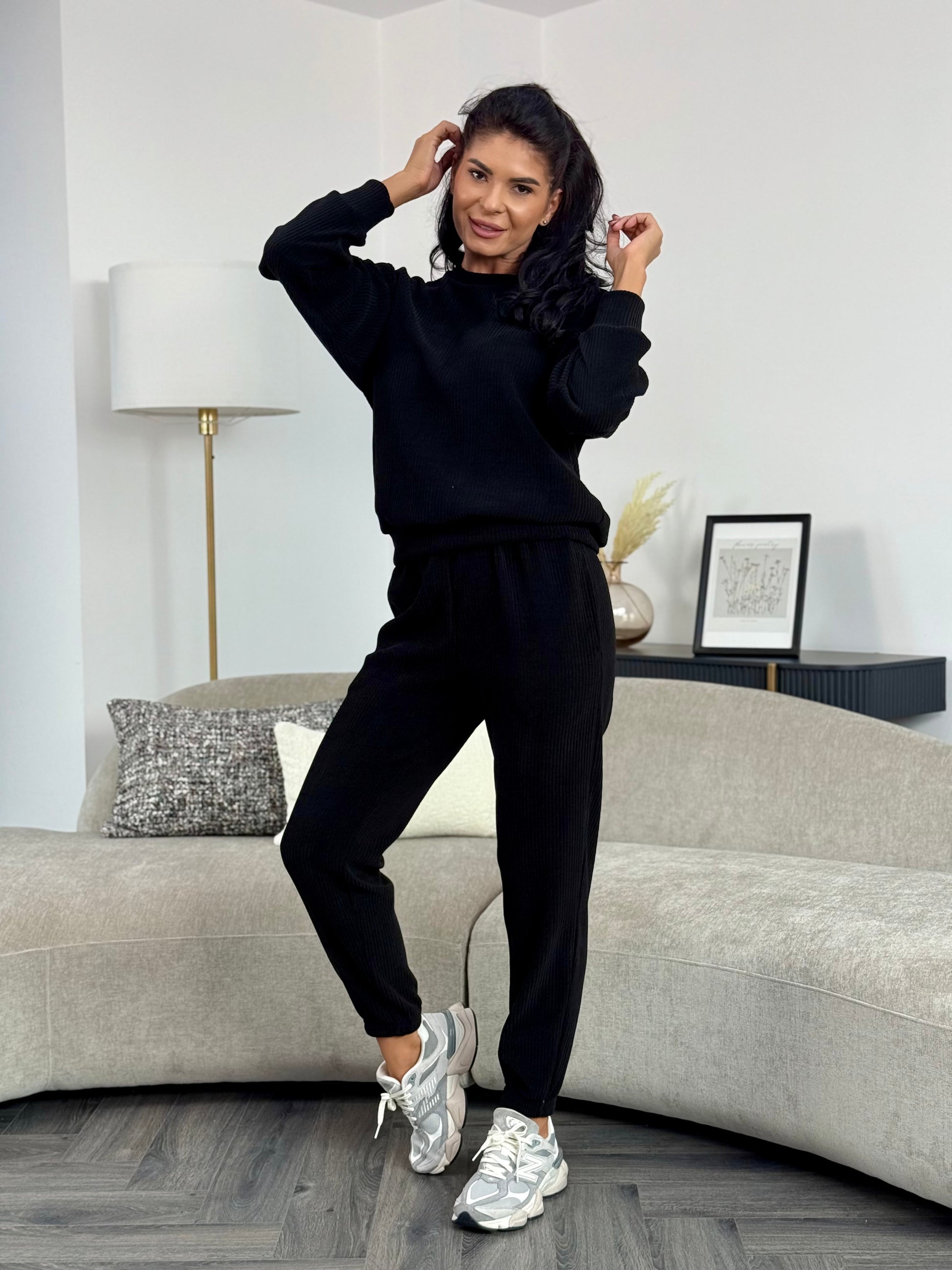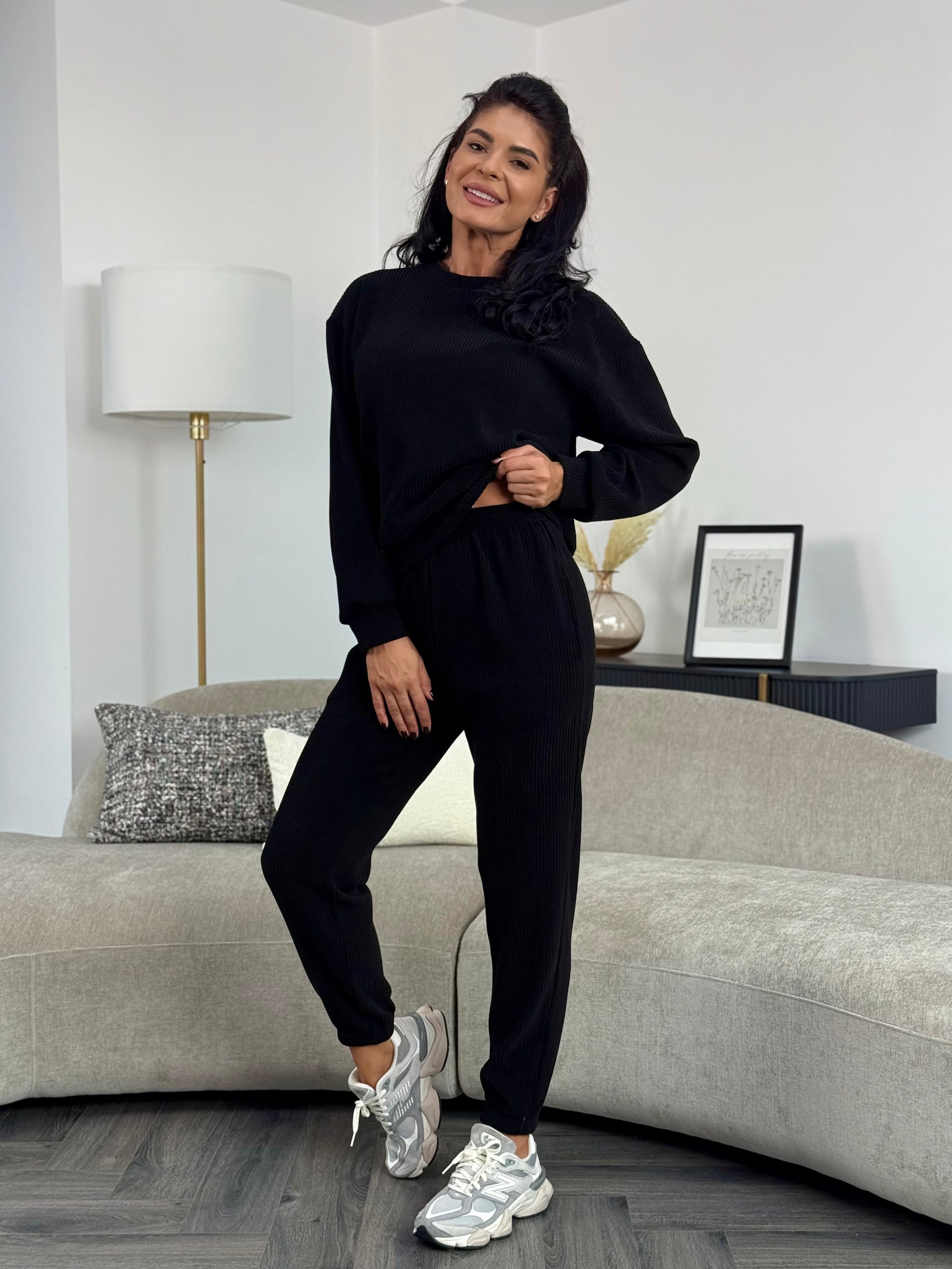 Costum din două piese, realizat din catifea reiat moale și confortabil. Bluza are croi lejer, cu mâneci lungi și linii fluide, oferind un aer modern și relaxat. Pantalonii au talie elastică și croi conic, care subțiază și alungește silueta.