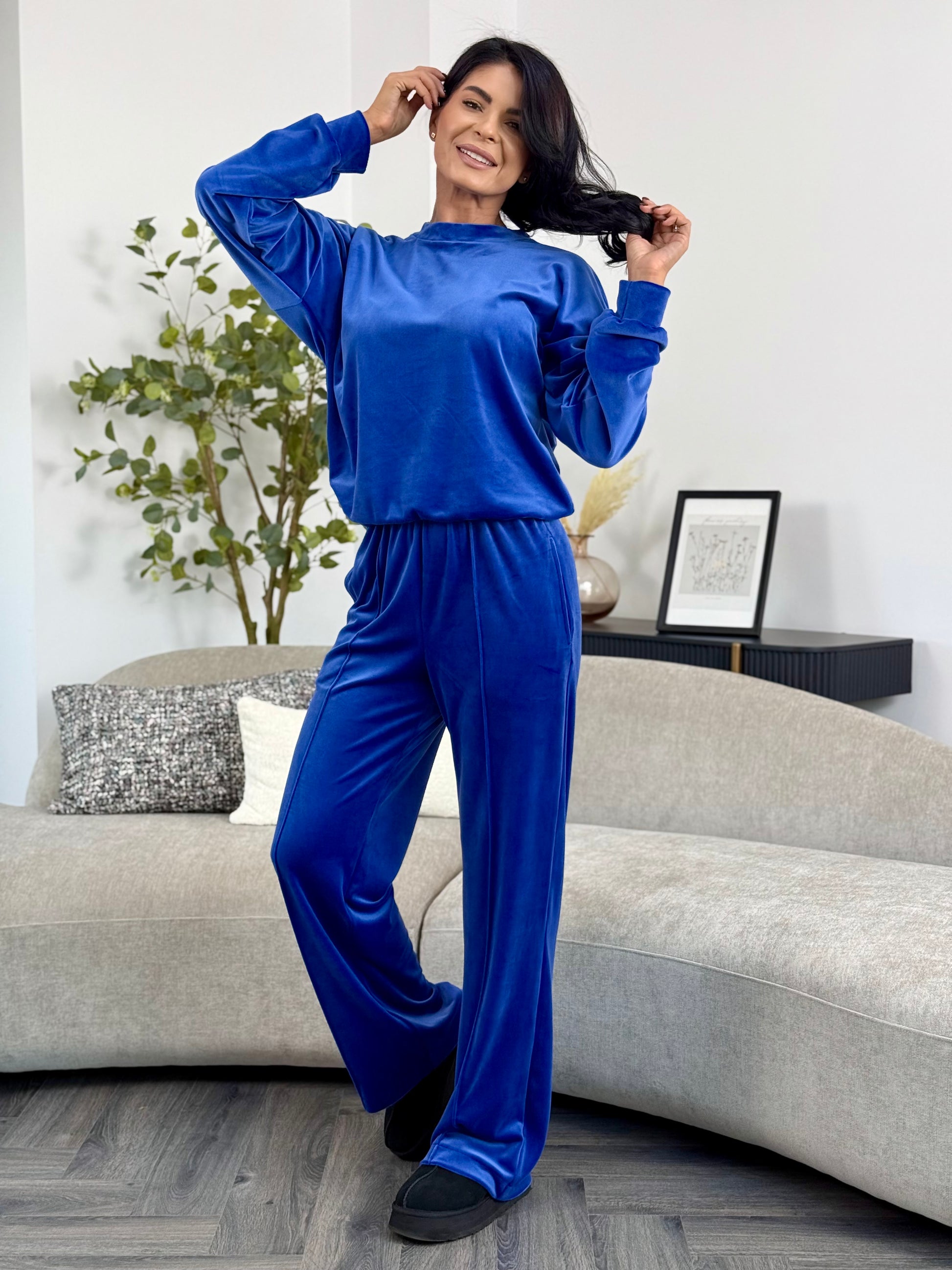 Un set modern și confortabil, realizat din catifea soft, cu textură moale și plăcută la atingere. Bluza are croială lejeră, cu mâneci lungi și tiv sub formă de bandă realizată din același material, oferă libertate de mișcare și un look relaxat. Pantalonii sunt cu talie elastică, croi drept și lejer, alungind silueta și asigurând confort la purtare.
