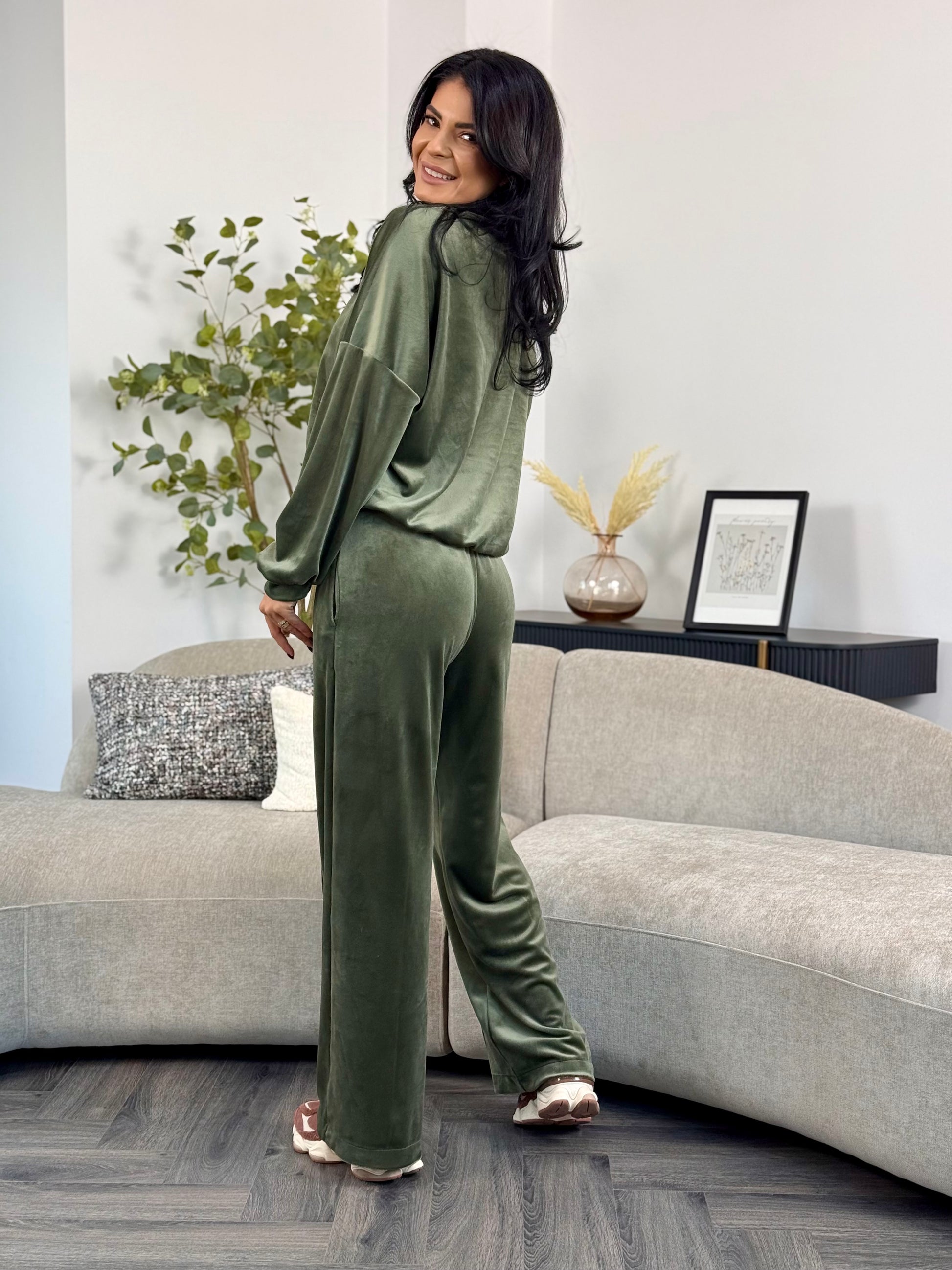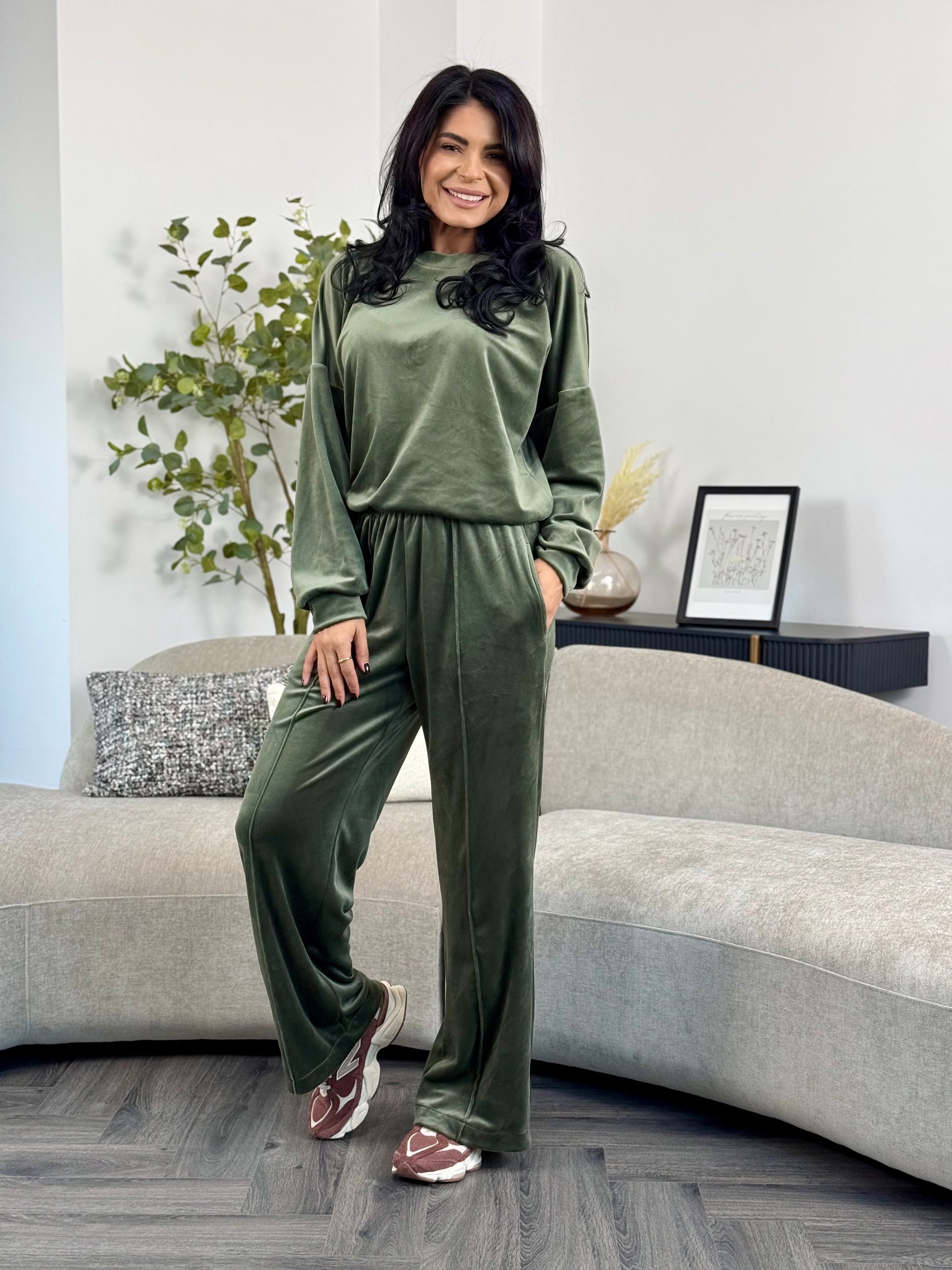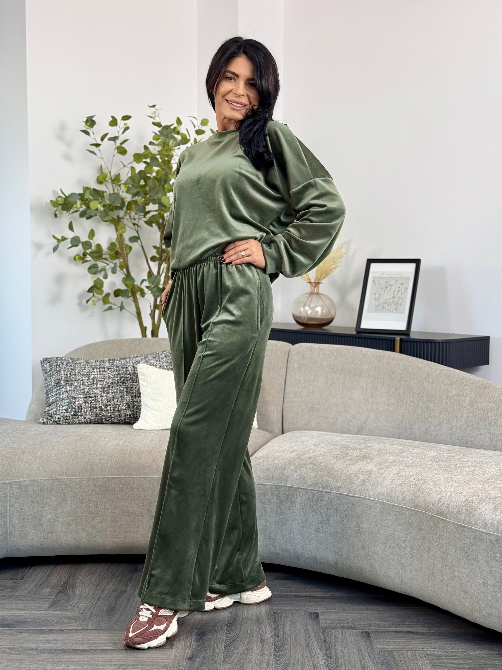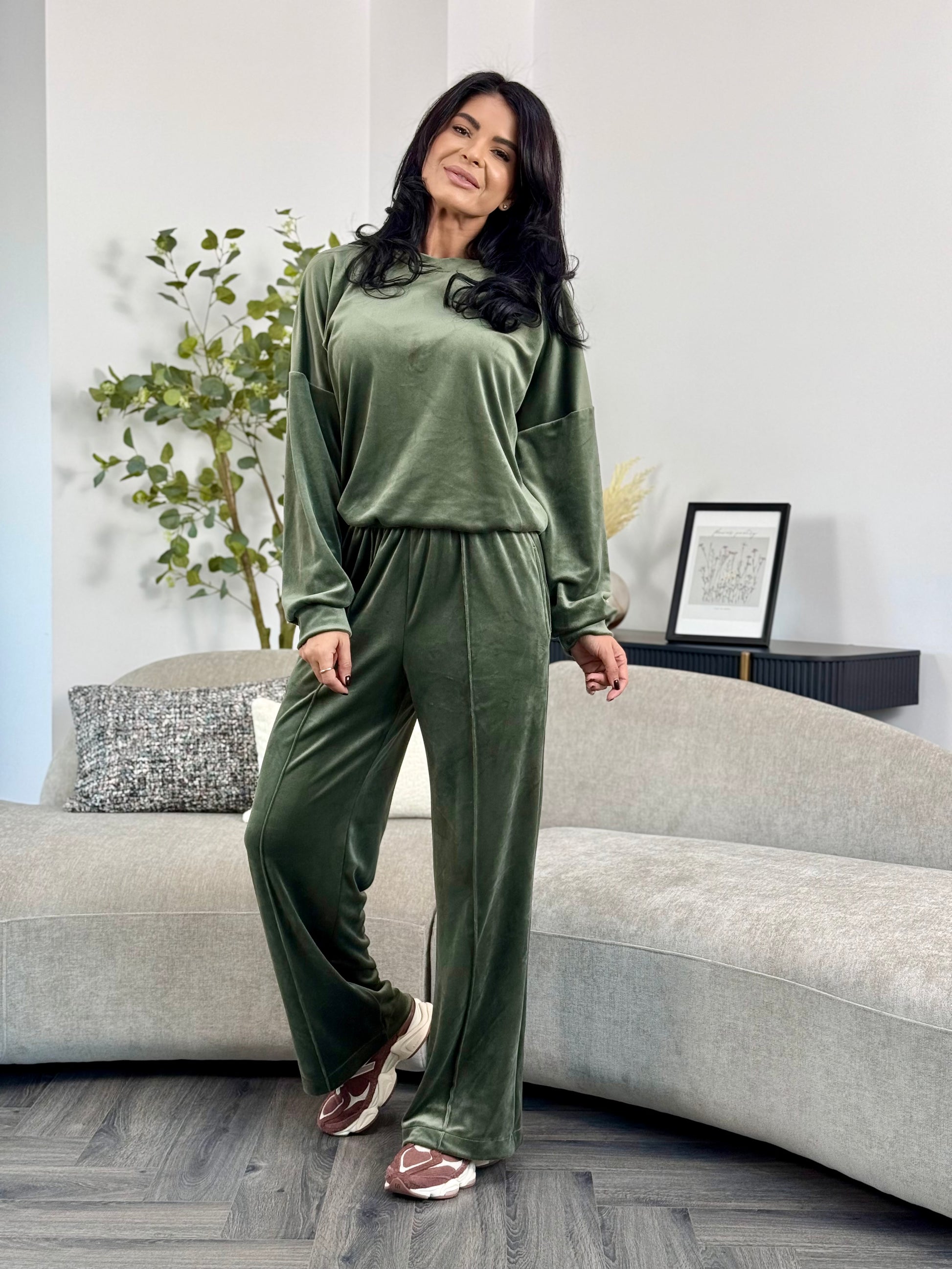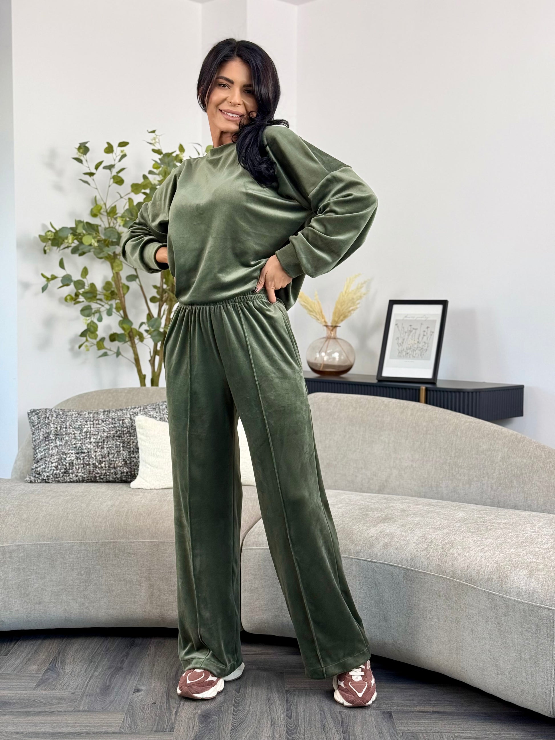Un set modern și confortabil, realizat din catifea soft, cu textură moale și plăcută la atingere. Bluza are croială lejeră, cu mâneci lungi și tiv sub formă de bandă realizată din același material, oferă libertate de mișcare și un look relaxat. Pantalonii sunt cu talie elastică, croi drept și lejer, alungind silueta și asigurând confort la purtare.
