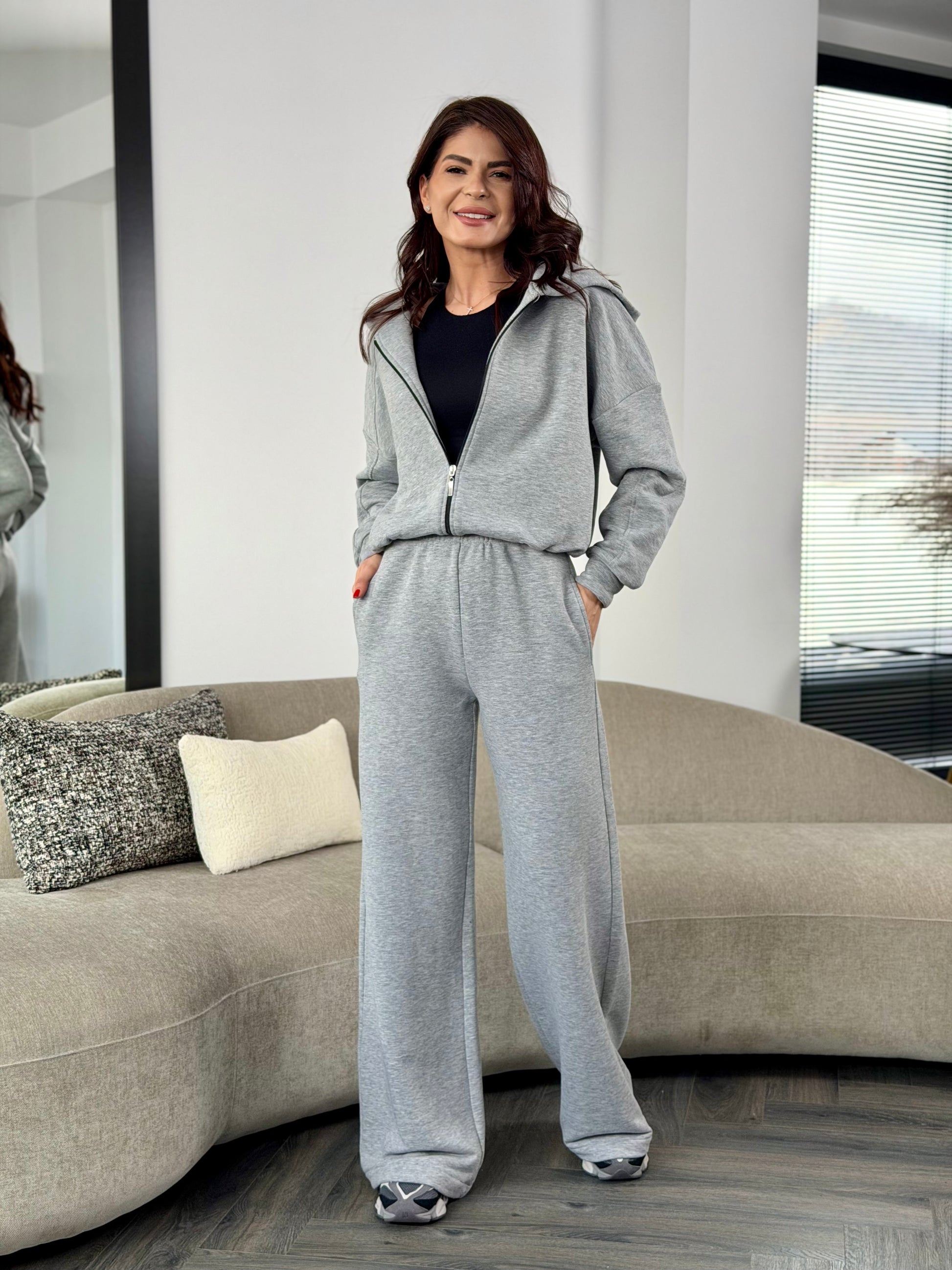Set casual-sport din bumbac, compus din hanorac cu fermoar și pantaloni lejeri, creat pentru confort și versatilitate. Este un outfit modern, ușor de purtat zilnic, care îmbină funcționalitatea cu un design curat și feminin.