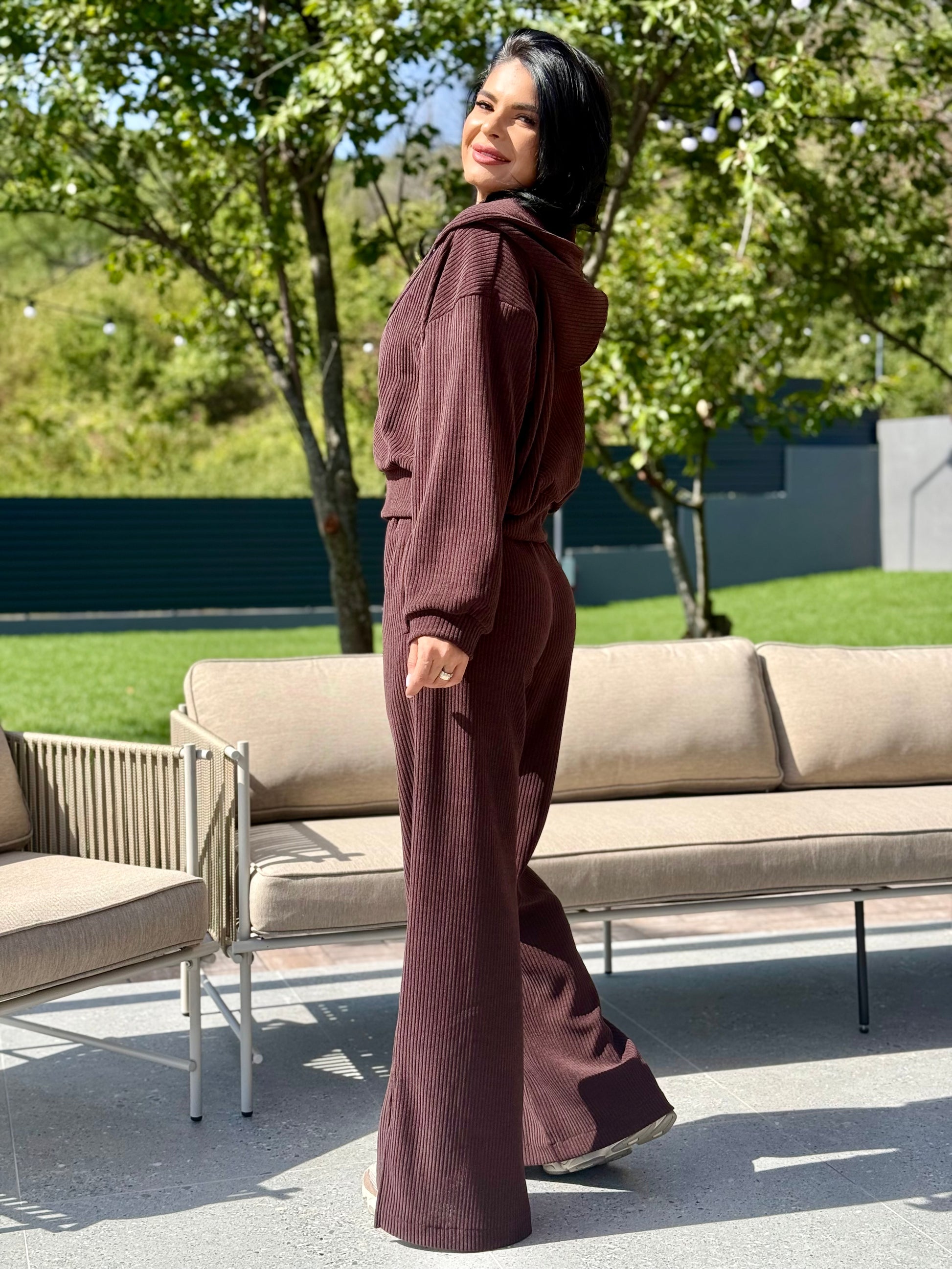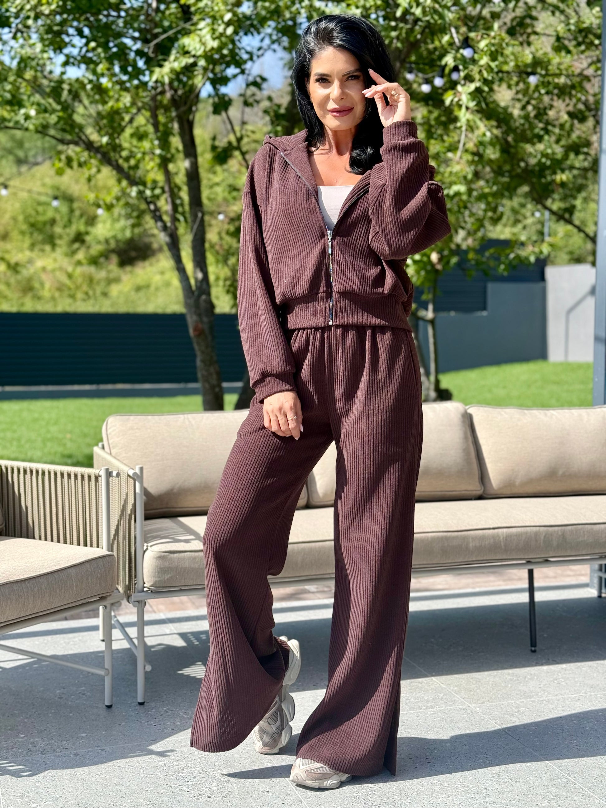 Set modern și versatil din catifea reiată moale și plăcută la atingere. Bluza are croi lejer, tip hanorac cu fermoar, glugă practică și buzunare laterale, completată de pantaloni cu talie elastică și croi drept, ușor evazat, care alungește silueta și oferă confort la purtare. Un ansamblu comod și stylish, ideal pentru zilele în care vrei să îmbini confortul cu un look modern – poate fi purtat cu sneakers pentru un stil casual sau cu bocanci/botine pentru un outfit urban de toamnă.