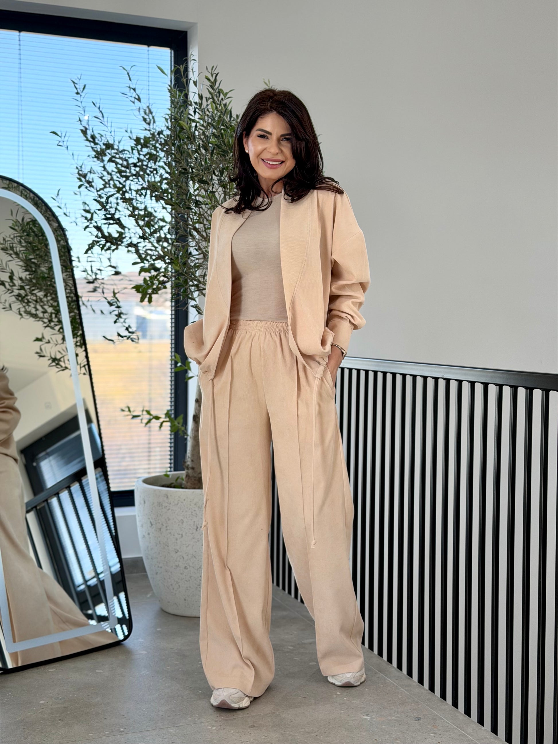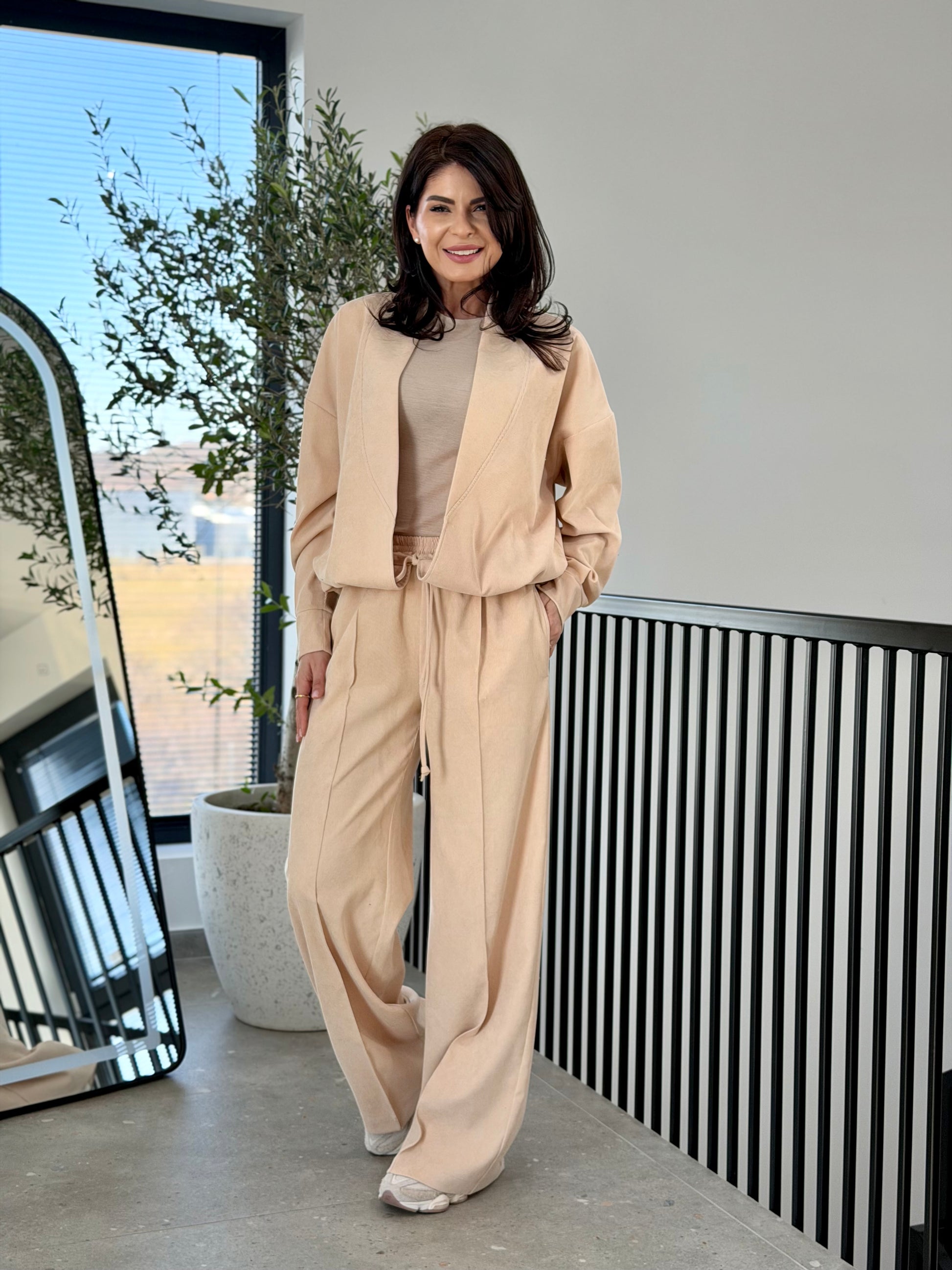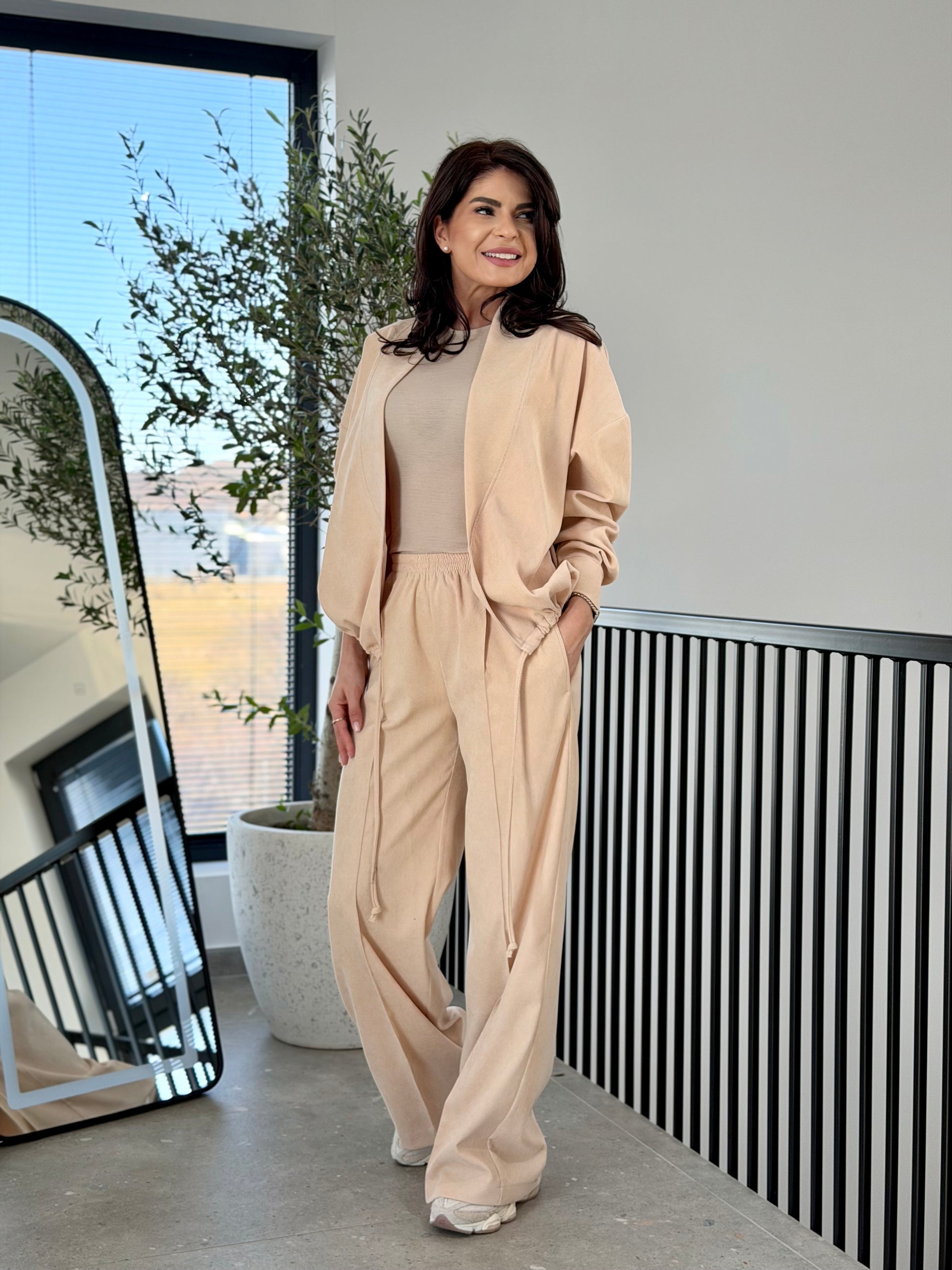 Jacheta are un tipar modern, snur, linie minimalistă și croi lejer, oferind libertate de mișcare și un look actual. Pantalonii sunt realizați pe un tipar amplu, cu talie elastica, asigurând confort și o potrivire naturală pe siluetă.